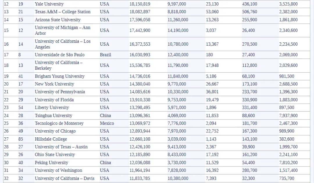 霸榜实锤:top20中13所美校,top100占38席,堪称 “主场作战”。斯坦福的校友网络、哥大的媒体资源,在知名度指标里直接拉满。