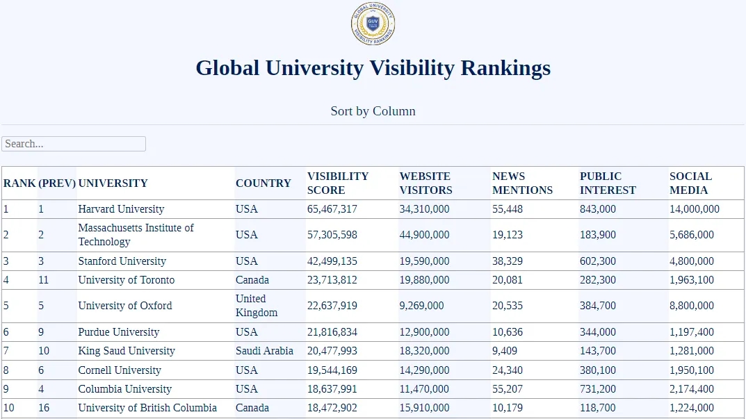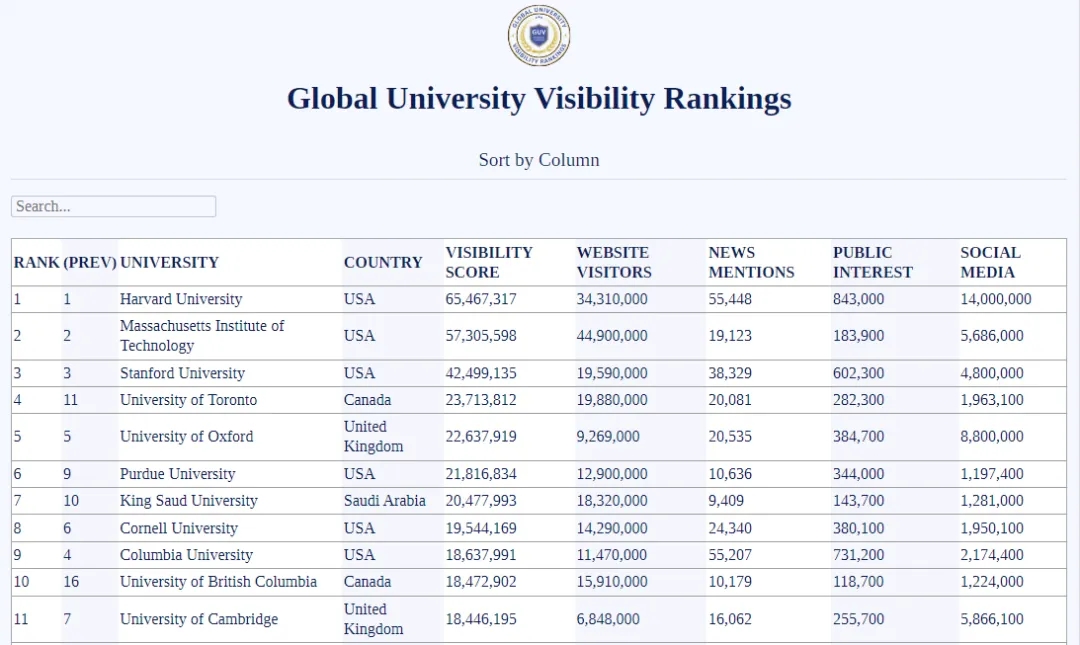 近期各类世界大学排名层出不穷,有的衡量学术声誉,有的看重出版物与国际化。而由American Caldwell发布的GUV排名,则是考察全球大学知名度,基于过去12月大学品牌实力和突出程度进行比较。