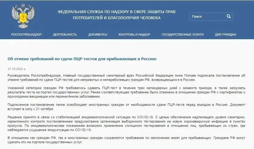 10月26日,俄罗斯驻华大使馆发文章,官宣了关于对抵达俄罗斯的人员取消核酸测要求的决定。