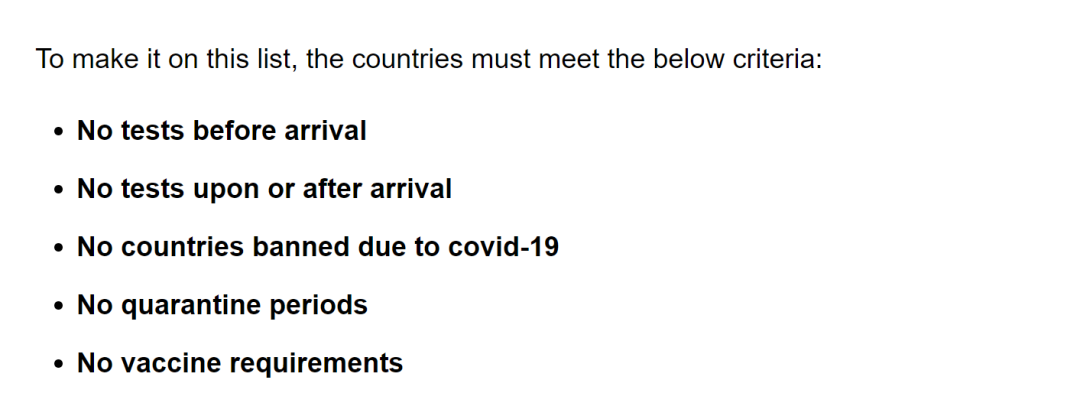 要入选这个没有新冠入境限制的国家和地区名单,必须满足以下条件: