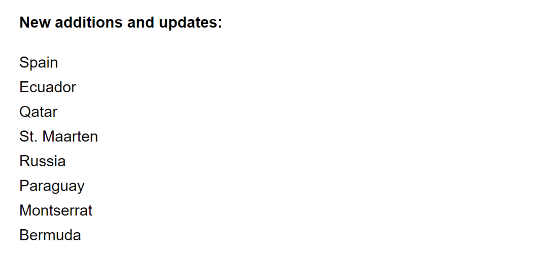 最新入选国家和地区名单:西班牙、厄瓜多尔、卡塔尔、圣马丁岛、俄罗斯、巴拉圭、蒙特塞拉特、百慕大群岛。