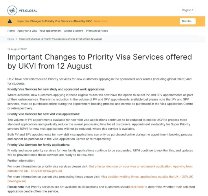 英国签证中心官网发布最新消息,自8月12日起,英国学生签证重新恢复加急服务。这对于中国的同学来说不愧为一个特大好消息,特别是一些出结果特慢的学校,这样很多同学就能够赶得上开学了。现在新办理的学生签证可以使用PV和SPV服务,即加急服务。可用的PV和SPV预约数量没有减少,但请注意这些服务必须预约时在线购买,不能在签证申请中心购买。