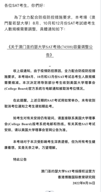 中国澳门圣约瑟大学SAT考场突然取消了8月、10月、12月部分学生考位!公告称,因配合防疫要求,需要缩减考场人数,因此部分考生被取消考位!如果被临时取消了考位,我们该如何补救呢? SAT考位取消的消息着实让不少家长和学生急成一团!特别是8月27日马上就要考试的同学,都已经在备考的最后阶段了,CB官方却突然的取消考场,让家长和同学措手不及! 不管怎样,首先要考虑的还是接下来怎么办。根据公告和我们统计的情况看,取消考位的同学只占较少一部分,10年级、11年级的同学较多,12年级的同学基本没有受到影响。 8月、10月和12月的SAT考试还是会如期进行,没有被取消考位的考生是可以如期赴考的。被取消考试的同学会陆续收到CB邮件通知,但即使没有收到CB邮件通知的同学,也建议立刻查看下自己的CB账户,如果发现自己已报名的8月、10月、12月考试显示为取消状态,那么确实就是被取消了。 考试显示为取消状态的同学,需要迅速做出考试安排调整,制定好后续备考和考试方案。 1.今年申请的同学,托福已经达到了目标分数,且又要SAT出分的话,就需要认真抢考位。 2.今年申请,不是必须要SAT成绩的话,那么可以考虑转投ACT。在不确定面前,就看哪个更能确定了。尤其是校内有ACT考点的同学,就不要折腾了,避免浪费时间和精力。 3.今年申请,但托福还没分手。这种情况,就需要全心备考托福,就算9月份能考出托福分数,剩下两个月能取得SAT目标分数的概率也不高,就不要浪费自己的时间了,不如把精力放在文书准备上,毕竟大部分学校本申请季依然是标化可选政策。 4.新高二的同学,今年不是必须要出分的,可以缓考到明年再考。理解有些高二年级的同学是想趁着现行纸笔考试尽早出分,但计划赶不上变化,同学们可以准备下SAT机考,报名明年的考试。 如果确定了今年SAT想要出分,SAT考位取消后,该怎么办?对于8月着急出分的同学,10月立即转考可能是目前最好补救方案了。可以转到临近的新加坡考场(报考截止时间是9月2日)。在疫情的几年里,新加坡的一些考场从未有取消考位的情况发生,比如Stamford考点,考位相对充足,最重要的是它每次SAT考试都如期举行,对于大陆学生而言,是目前比较推荐的报考考点了。 对于想10月出分的同学,建议10月、12月的考位都要报,以增加考试机会,防止不确定事项发生。对于国内的考生而言,中国澳门仍是第一选择,目前除圣约瑟大学外的两个考点可以正常报名。或者同学们也可以选择新加坡和中国香港考位。 这次取消考位的情况影响比较大的是去境外中国澳门考试的学生,国内国际学校自有考场完全不用担心。这次随机取消部分同学的考试资格后,中国澳门考点也在积极为同学们争取加开另外一个考场,但一切都需要等待通知。